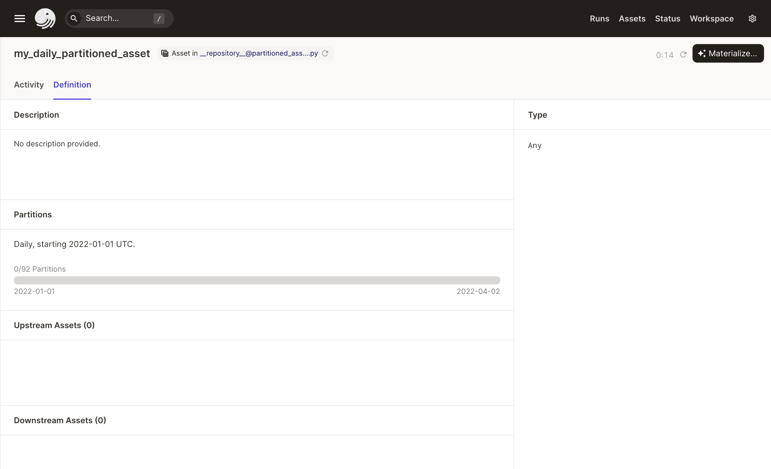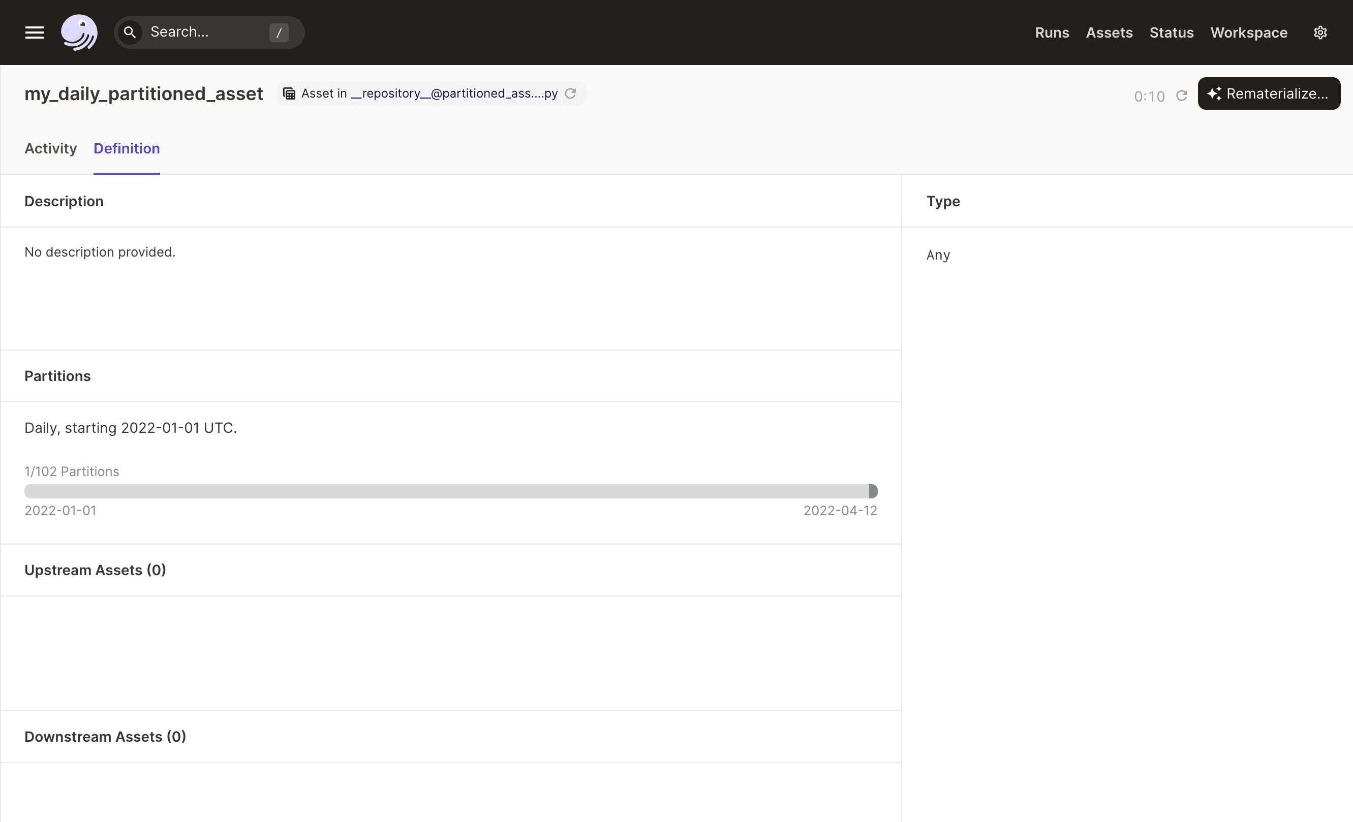 DailyPartitionsDefinitionA partitions definition with a partition for each day.